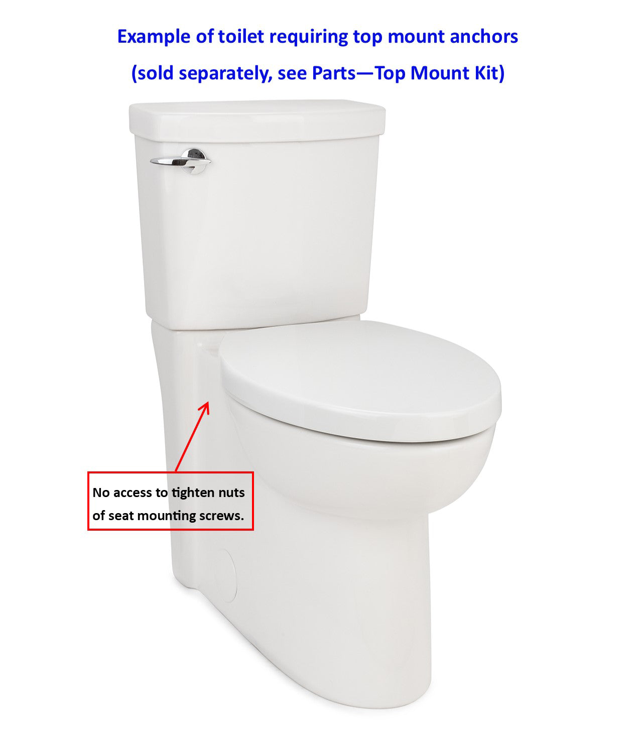 NOTE: Most toilet seats have "bottom mount" hardware included. "Top mount" hardware is required when a toilet bowl has "skirt", flat sides or concealed trapway (see photo examples). These toilets have no access under the bowl rim to secure or tighten hardware nuts.